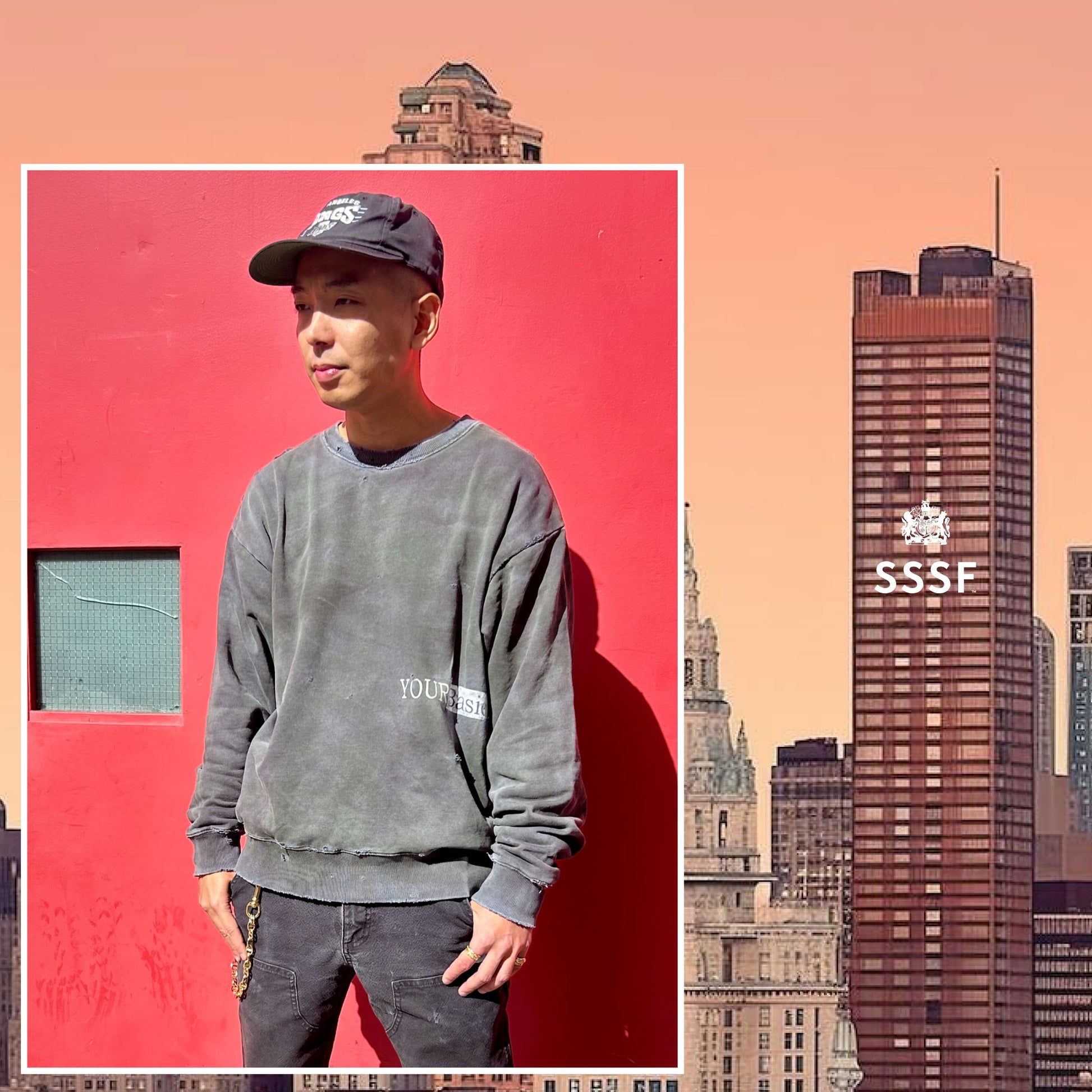 激しくグランジ加工を施した、セットインスリーブのBLACKスウェット。Marlboroの90s広告のプリントが誤って正確でない箇所に刷られた様子を表現しています。